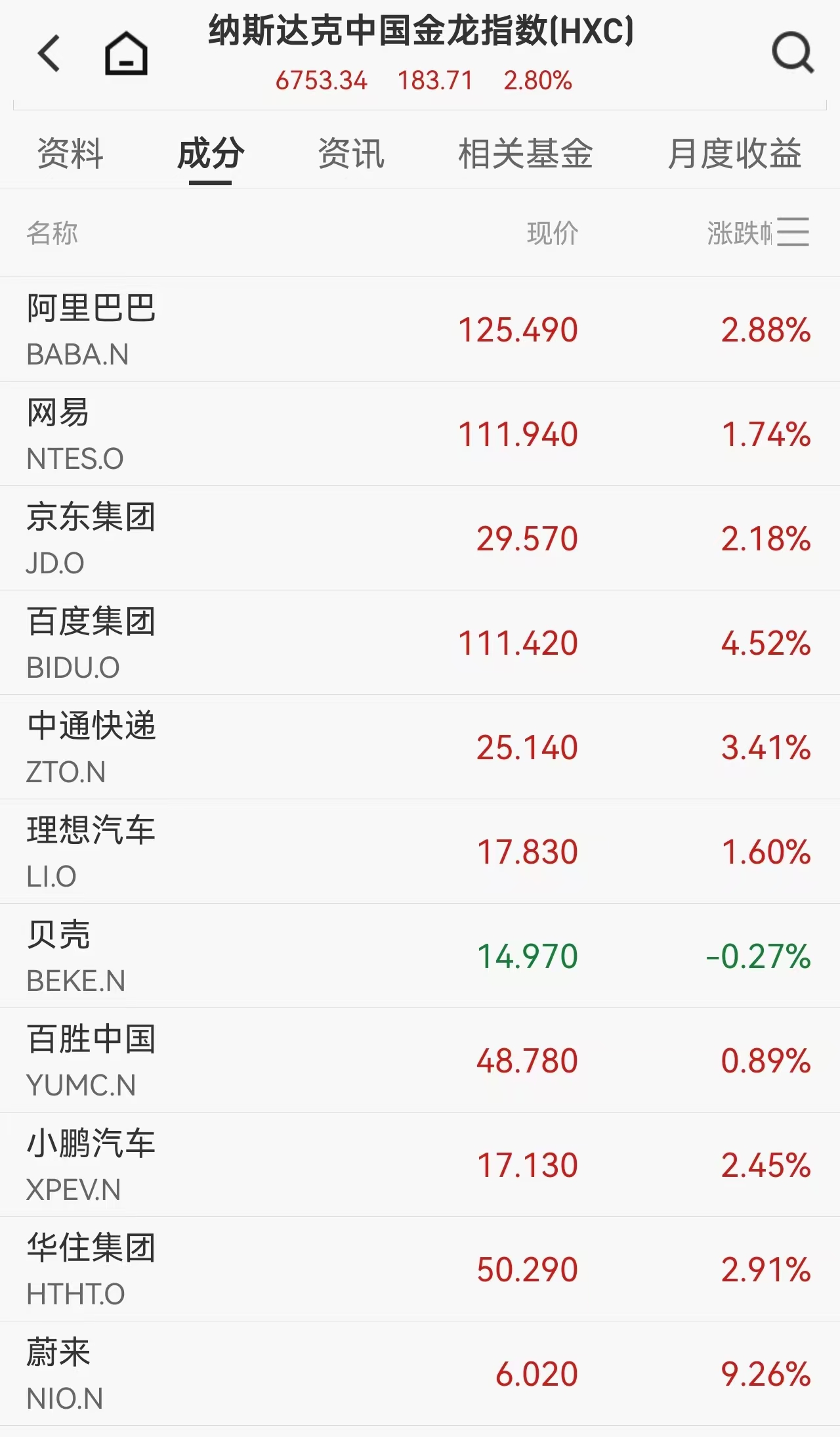 中概股同样表现亮眼,纳斯达克中国金龙指数上涨2.8%。蔚来汽车涨超9%,爱奇艺涨逾6%,百度、哔哩哔哩涨超4%,阿里巴巴、京东、小鹏汽车涨幅均超过2%。这一涨势延续了近期中概股相对强势的表现。