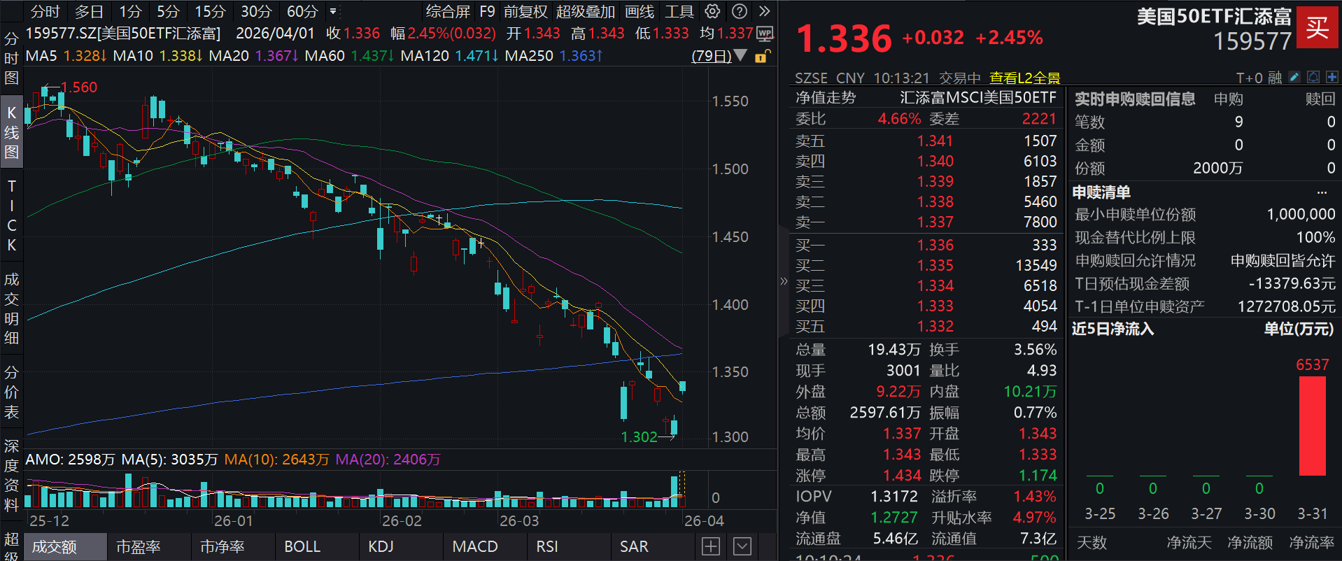 截至2026年4月1日10:13,美国50ETF汇添富(159577)上涨2.45%,最新价报1.34元。拉长时间看,截至2026年3月31日,美国50ETF汇添富近1年累计上涨15.60%。值得一提的是,美国50ETF汇添富(159577)同样于3月31日放开申购上限。