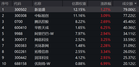 云计算ETF汇添富(159273)标的指数热门股多数飘红:华胜天成涨超6%,中际旭创、网宿科技、拓维信息涨超3%,腾讯控股、阿里巴巴-W、光环新网涨超2%,新易盛涨超1%。