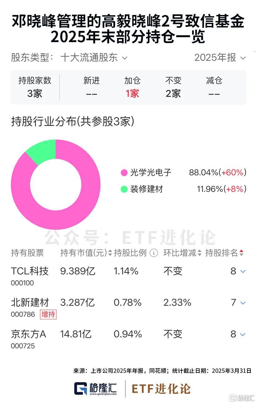 高毅晓峰2号致信基金四季度对TCL科技和京东方A持仓数不变。