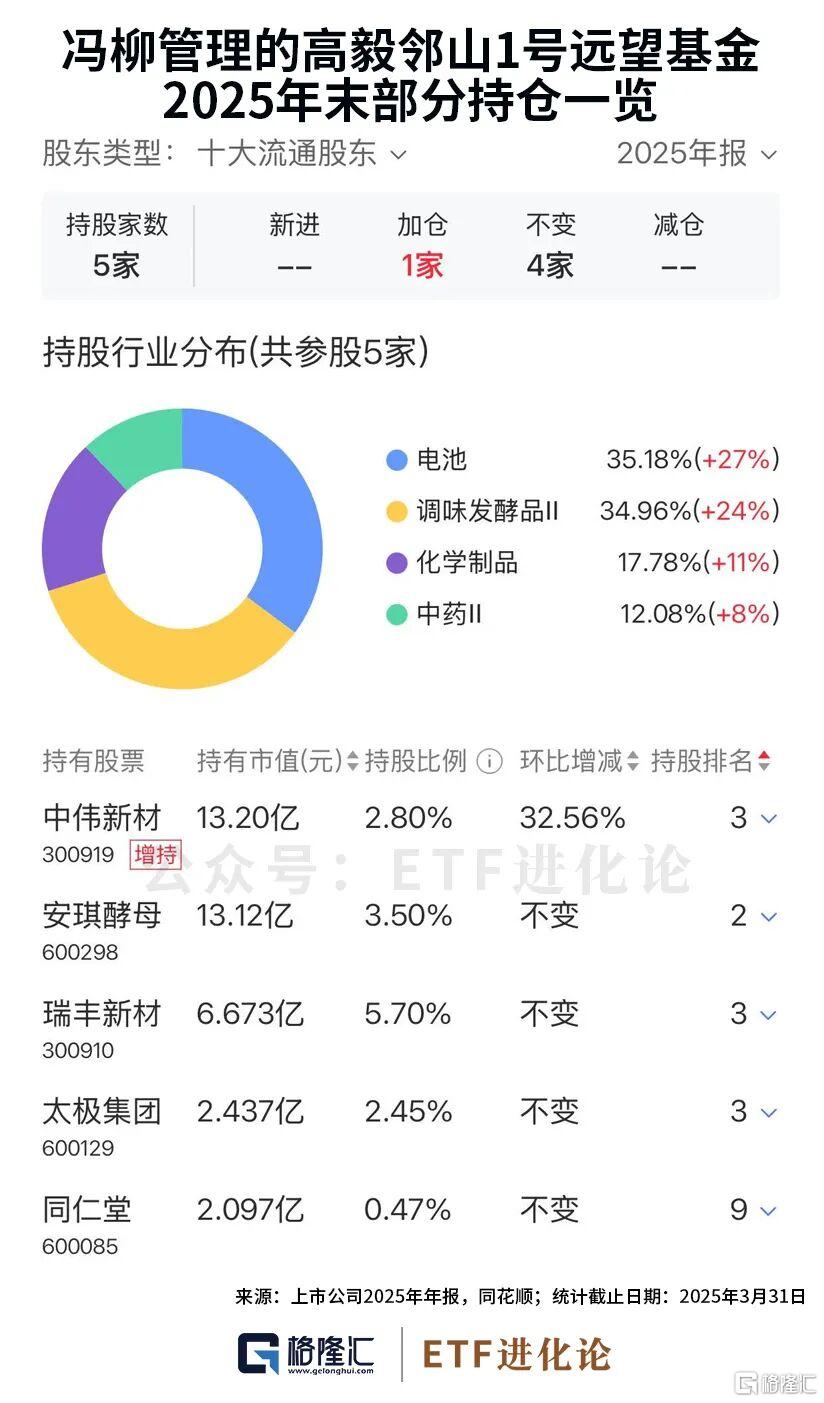 截至4月1日上市公司公布的年报数据显示,冯柳管理的高毅邻山1号远望基金四季度进入5家A股前十大流通股东名单中。
