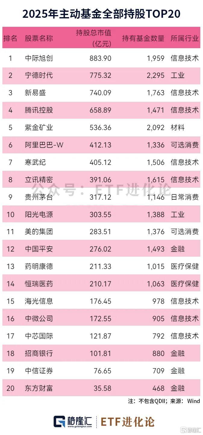 2025年年报数据显示,2025年末,中际旭创的持股总市值位列主动基金第一,达883.90亿元,被1959只主动基金共同持有。