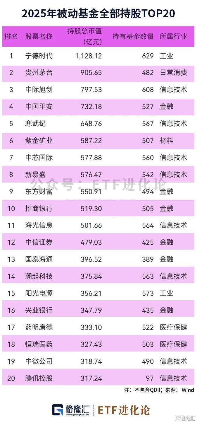 被动基金全部持股中前三大重仓股分别为宁德时代、贵州茅台和中际旭创,2025年末持仓市值分别为1128.12亿元、905.65亿元、797.53亿元。