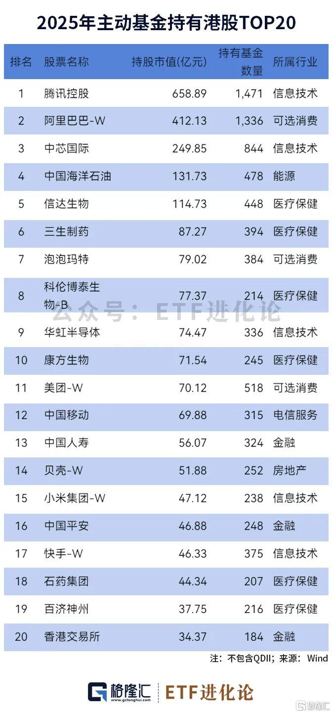 2025年末主动基金的前3大重仓港股为腾讯控股、阿里巴巴、中芯国际,持仓市值分别为658.89亿元、412.13亿元、249.85亿元。
