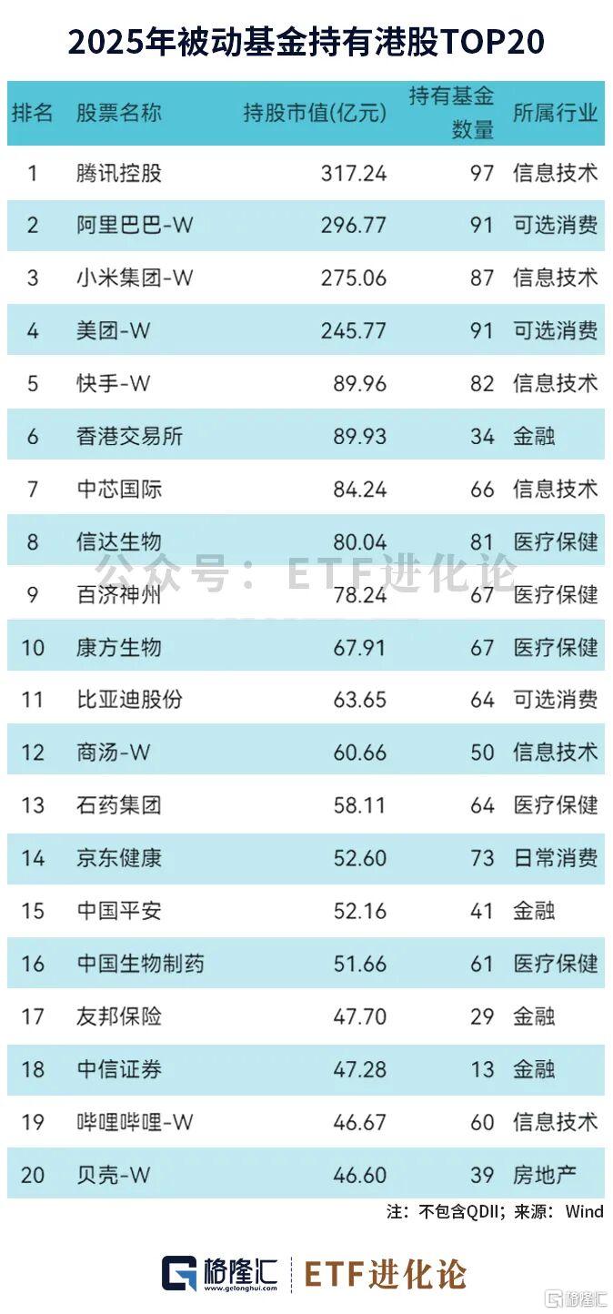 2025年末被动基金的前3大重仓港股为腾讯控股、阿里巴巴、小米集团,市值分别为317.24亿元、296.77亿元、275.06亿元。