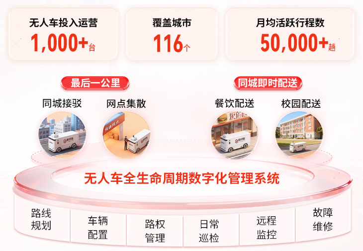 如果说AI优化的是“大脑”,无人配送则是重构末端履约的“新四肢”。截至2025年末,顺丰同城的无人车网络已覆盖全国116个城市,运营车辆规模超1000台,月均活跃行程超5万趟。这意味着,当你漫步在城市街头,偶遇一台穿梭的无人配送车,其背后已是一个覆盖全国的、体系化的智能网络。