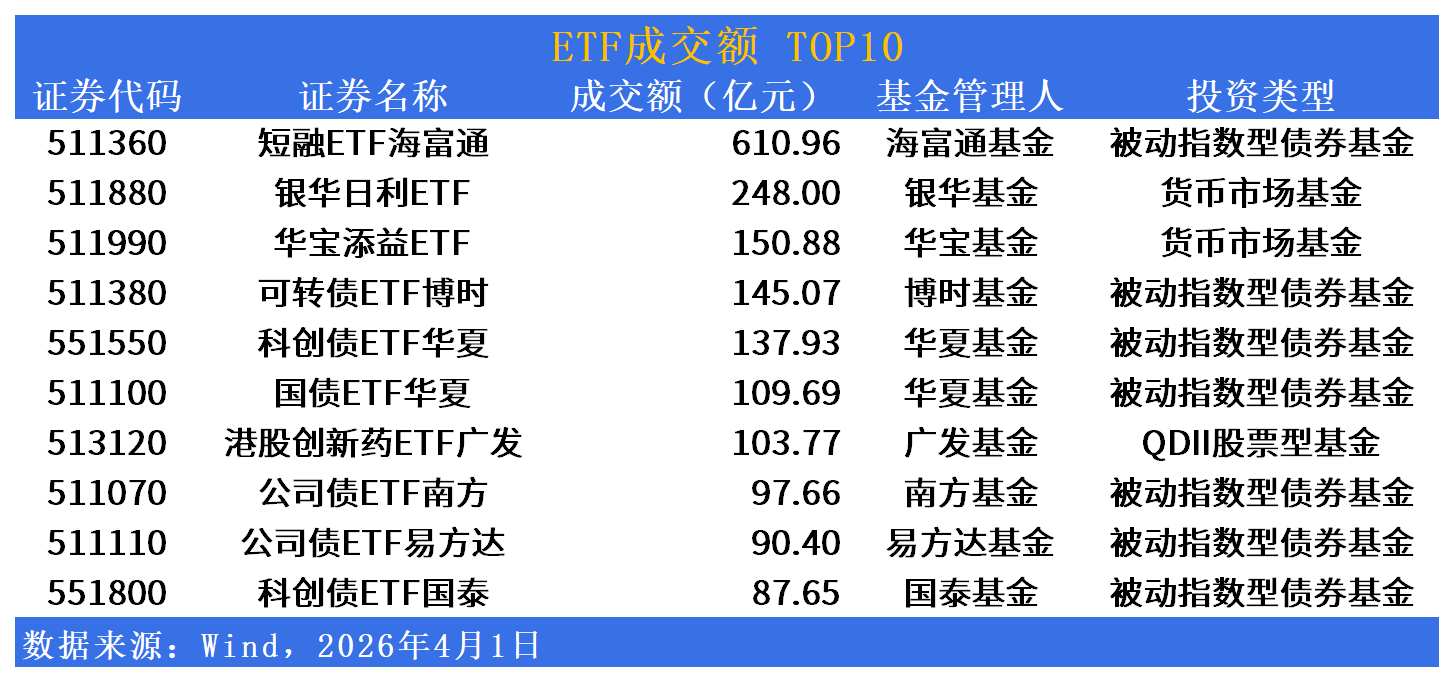 短融ETF海富通(511360)单日成交610.96亿元稳居榜首,银华日利ETF(511880)成交248.00亿元,华宝添益ETF(511990)成交150.88亿元,可转债ETF博时(511380)成交145.07亿元,科创债ETF华夏(551550)成交137.93亿元,国债ETF华夏(511100)成交109.69亿元。