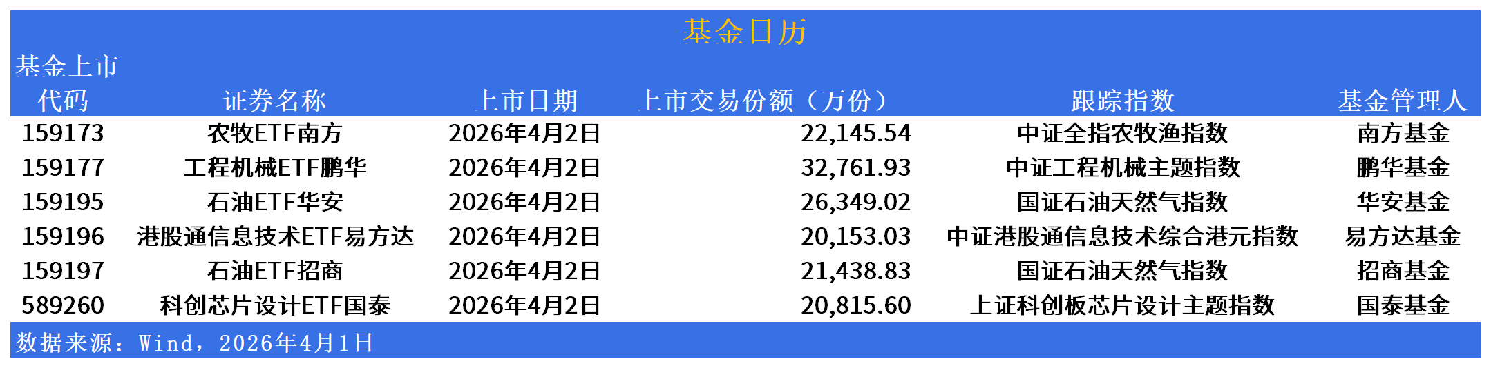 ETF发行市场方面,六只ETF明日批量上市,覆盖农牧、工程机械、石油、港股科技及芯片设计赛道