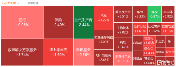 盘面上,大型科技股、大金融股等权重助力大市回升,其中百度涨近4%,阿里巴巴涨超3%,工商银行、建设银行、中国银行盘中再创历史新高;航空板块大涨,中国东方航空劲升12%领衔;生物医药股集体活跃,创新药方向涨幅居前;黄金股领衔有色金属股上涨,半导体股、重型机械股、电力设备股、苹果概念股、建材水泥股、濠赌股、军工股齐涨。