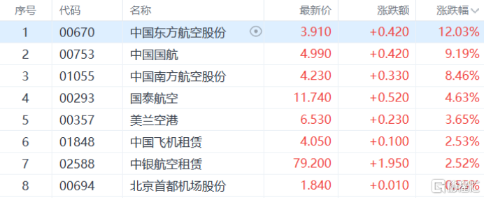 航空股上涨,中国东方航空股份涨超12%,中国国航、中国南方航空股份等多股跟涨。