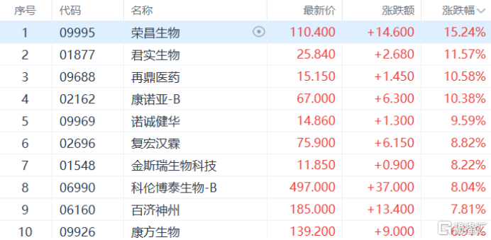 生物医药股走强,荣昌生物涨超15%,君实生物、复宏汉霖等多股跟涨。