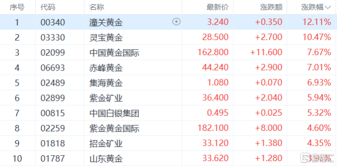 黄金股走高,潼关黄金涨超12%,灵宝黄金、赤峰黄金等多股跟涨。