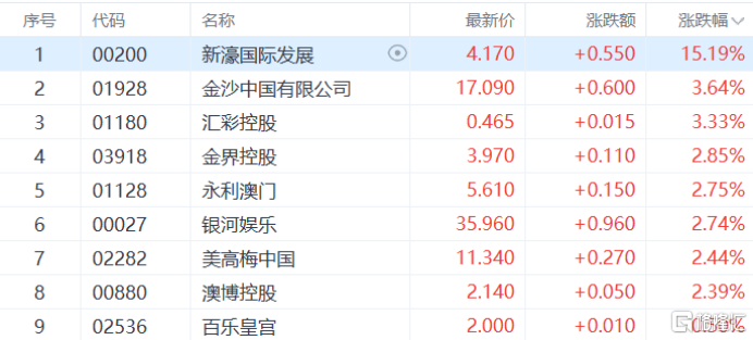 博彩股走俏,新濠国际发展涨超15%,汇彩控股、永利澳门等多股跟涨。
