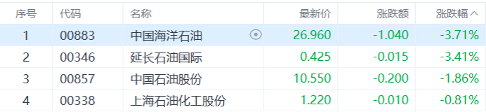 石油股走弱,中国海洋石油、延长石油国际跌超3%,中国石油股份、上海石油化工股份等多股跟跌。