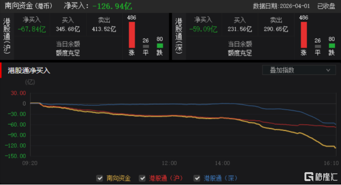 今日,南向资金净卖出126.94亿港元,其中港股通(沪)净卖出67.84亿港元,港股通(深)净卖出59.09亿港元。