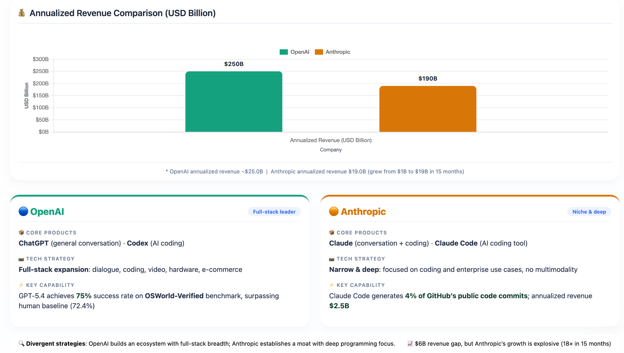 当前AI行业的竞争格局可以概括为“双雄并立,OpenAI仍执牛耳”。Anthropic在企业编程市场建立了深度壁垒,收入增速惊人,已成为不可忽视的挑战者。但OpenAI在资本规模、C端用户、技术广度、品牌认知等核心维度上依然保持着显著优势。