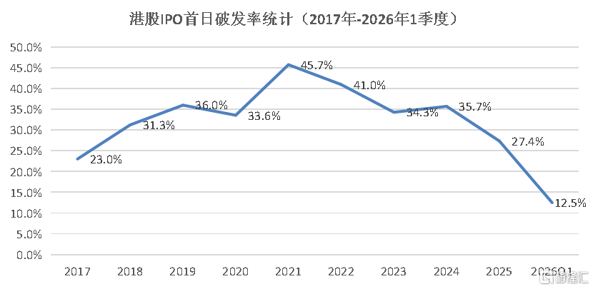 从上市首日涨跌幅表现来看,今年在港股上市的40只新股中,共33家在上市首日收涨,2家收平,5家收跌;上市首日破发率为12.5%,较2025年的27.4%进一步下降,创下了自2017年以来最低的破发率。