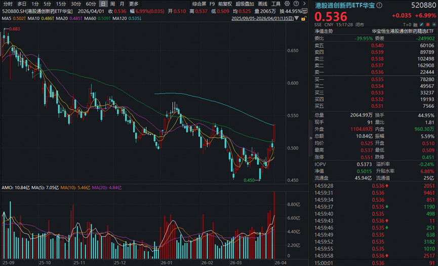 港股通创新药攻势尤为迅猛,520880午后涨幅最高飙至7.19%,收盘强势站上半年线!全天成交10.84亿元,创2025年8月4日以来新高!