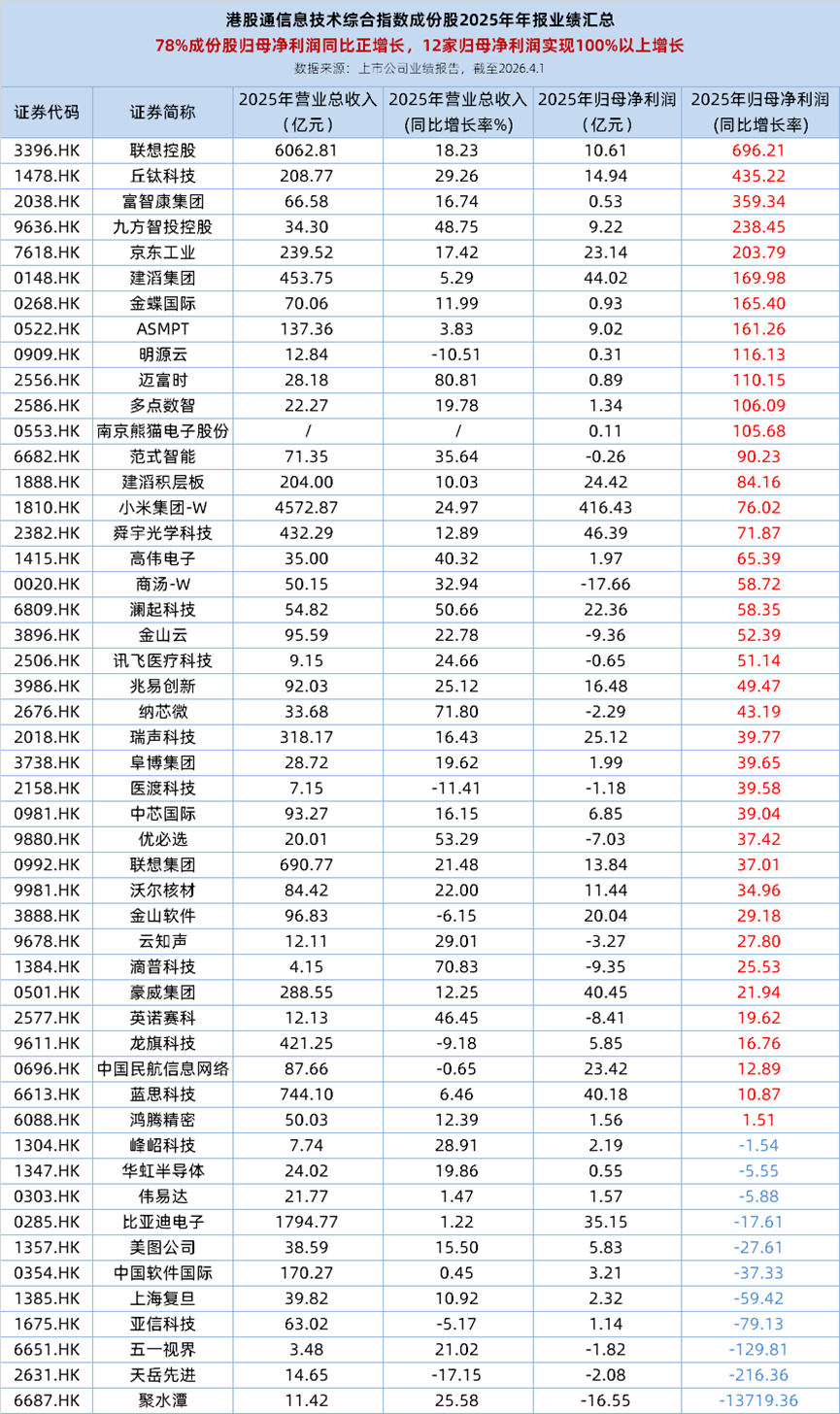 伴随AI算力需求爆发,港股硬科技板块2025年交出了亮眼的成绩单。截至4月1日,中证港股通信息技术综合指数50只成份股已全部披露2025年年报业绩。据统计,50只成份股中有39家实现归母净利润同比正增长,其中12家更是实现100%以上翻倍增长。联想控股2025年归母净利润10.61亿元,同比高增696%;丘钛科技2025年归母净利润14.94亿元,同比高增435%;小米集团-W狂揽416亿元净利润,同比大增76%!