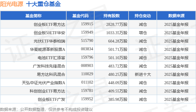 持有阳光电源最多的基金为创业板ETF易方达,目前规模为4.46亿元,最新净值3.2393(4月1日),较上一交易日上涨1.96%,近一年上涨53.95%。该基金现任基金经理为成曦 刘树荣。