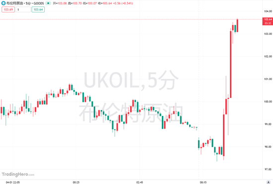 因特朗普威胁如果没有达成协议,将打击伊朗的能源设施,油价持续拉升,WTI原油突破103美元/桶,日内涨超4%。布伦特原油日内大涨4美元,报102.86美元/桶,涨幅4.06%。
