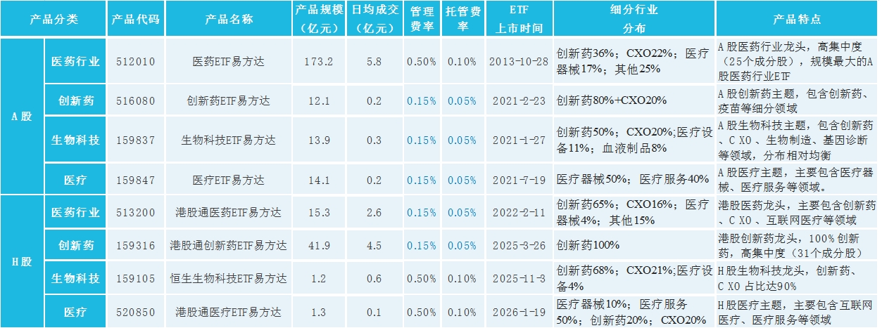 然而对普通投资者而言,投资医药板块个股面临诸多挑战,管线、临床、监管、出海订单跟踪等方面跟踪门槛极高,与其追逐单个“爆款”,不妨考虑用ETF编织一张覆盖产业龙头的投资网络。为帮助投资者高效布局上述结构性机会,易方达提供了完整的医药指数产品矩阵,既包含能够表征A股、港股、美股市场医药整体表现的指数产品,也包含创新药、生物科技、医疗等细分领域,来满足不同风险偏好和配置需求。