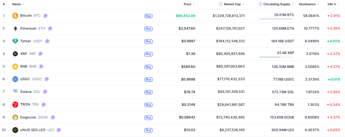 4月2日,受美国总统特朗普对伊朗的反转态度影响,加密市场转涨为跌。其中,比特币 (BTC) 大跌2.91%,跌至6.6万美元附近;以太坊 (ETH) 跌3.39%,回落至2,000美元;瑞波币下跌2.57%,报1.3美元,其他主流币均出现不同程度的跌幅。