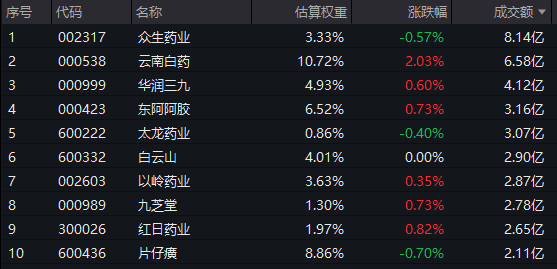 中药ETF汇添富(560080)标的指数热门股涨跌互现:云南白药涨超2%,华润三九、东阿阿胶、以岭药业、九芝堂微涨;下跌方面,众生药业、太龙药业微跌。