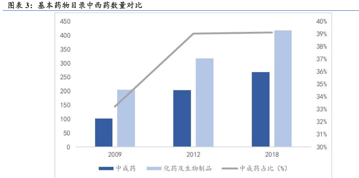 3、中西药并重:明确中成药与化学药、生物制品分类管理,但地位平等。新规将国家基本药物分为“化学药品和生物制品”、“中药(含中药饮片和中成药)”两大类,分别依据临床药理学和功能进行分类。在2012、2018版的基药目录中,中药产比基本稳定在接近40%的占比,预计后续也将维持这个占比数量。