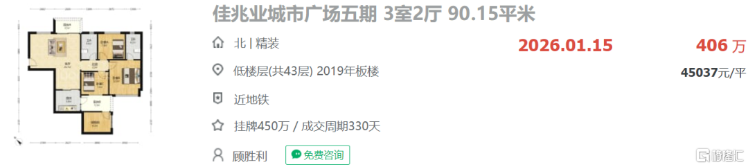 标杆小区佳兆业城市广场五期90.15平3房单价约4.5万/㎡;