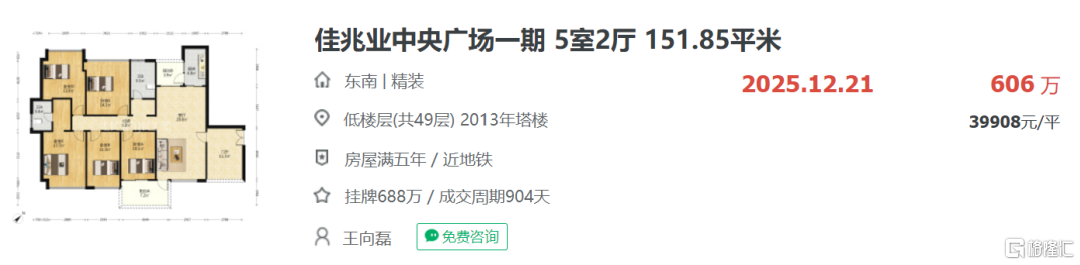 佳兆业城市广场一期151.85平5房,单价约,3.99万/㎡;
