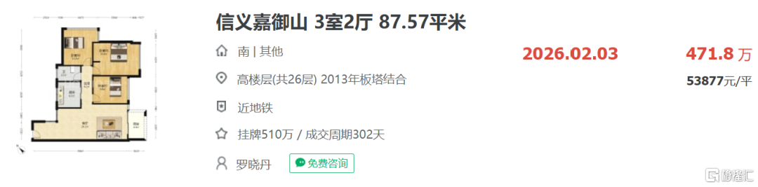 信义嘉御山最新成交的87.57平3房,单价也才约5.39万/㎡。