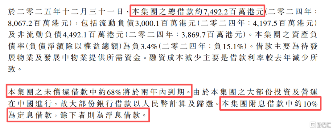 业绩表面光鲜,内里承压,集团总借款高达7492.2百万港元,相比2024年的8067.2百万港元,降低了约7.13%,但未偿还的借款中有68%是在两年内到期,且90%为浮动利息借款。