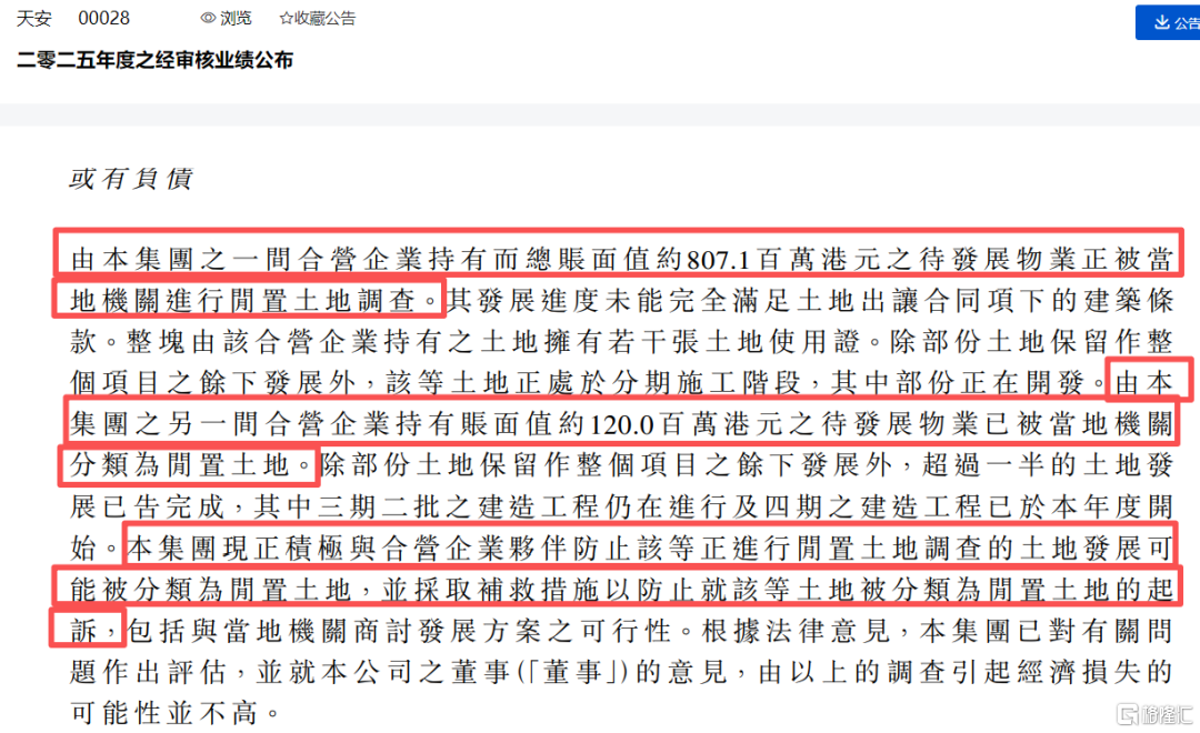 公司集团旗下还有总账面值约8.071亿港元的土储正被进行闲置土地调查,同时也有账面值约1.2亿港元的土地被分类为闲置土地。
