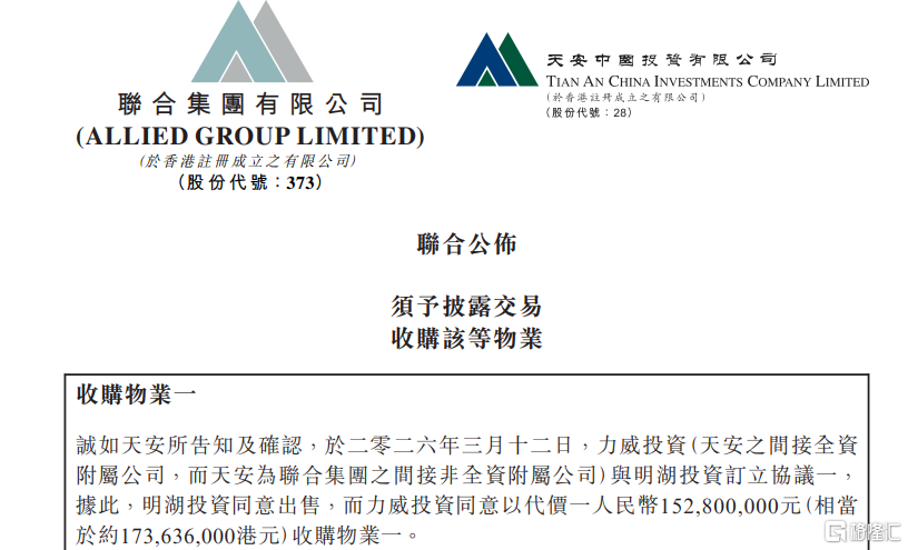 根据公司披露的交易公告,3月12日,天安中国投资与联合集团联合通过旗下间接全资附属公司从合作方骏业手中收购三个物业,包含位于深圳光明云谷产业园及坂田云谷相关物业,交易对价合计约6.76亿元。