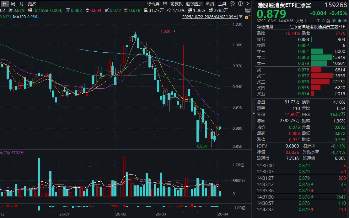 港股消费方面,聚焦纯正新消费的港股通消费ETF汇添富(159268)继昨日反弹后回调0.45%,盘中成交额突破2700万元!热门成分股中,泡泡玛特、老铺黄金跌超2%,海尔智家跌超1%,李宁微跌(成分股仅做展示,不作为个股推介)。