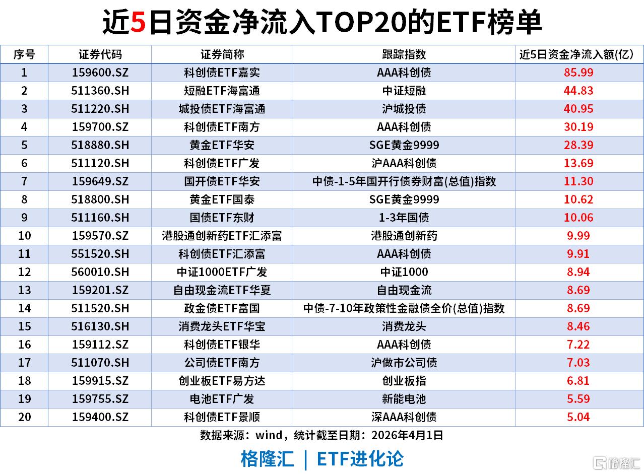 黄金与避险:黄金ETF华安、黄金ETF国泰等黄金相关品种合计流入超13亿,货币基金、城投债等固收类同步获配置,避险需求温和释放。