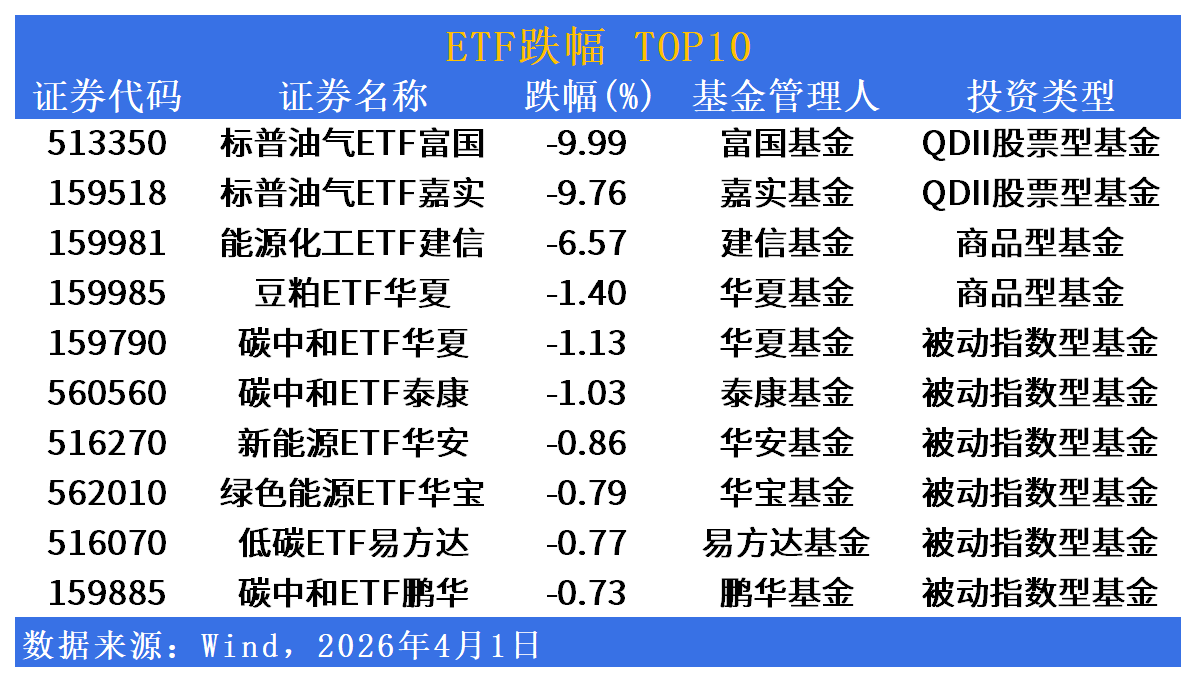 标普油气ETF富国(513350)单日涨6.51%居首,标普油气ETF嘉实(159518)涨5.95%,能源化工ETF建信(159981)涨5.72%,油气ETF博时(561760)涨4.05%,油气ETF汇添富(159309)涨3.91%,油气ETF银华(563150)涨3.87%,石油ETF景顺(159588)涨3.47%,石油ETF富国(159148)涨3.36%,石油ETF国泰(561360)涨3.11%,石油ETF鹏华(159697)涨3.06%,油气与能源板块集体爆发。