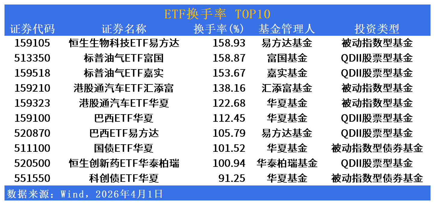 换手率维度,标普油气ETF富国(513350)换手率352.57%居首,标普油气ETF嘉实(159518)换手率299.65%,恒生生物科技ETF易方达(159105)换手率170.79%,港股通汽车ETF华夏(159323)换手率165.90%,港股通汽车ETF汇添富(159210)换手率130.16%,恒生创新药ETF华泰柏瑞(520500)换手率127.05%,跨境与债券品种交投活跃。