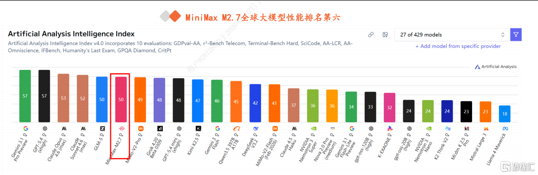 其M2.7模型的智能指数达49.6,与OpenAI、Anthropic等全球龙头的差距不足5个点,技术实力具备全球竞争力;