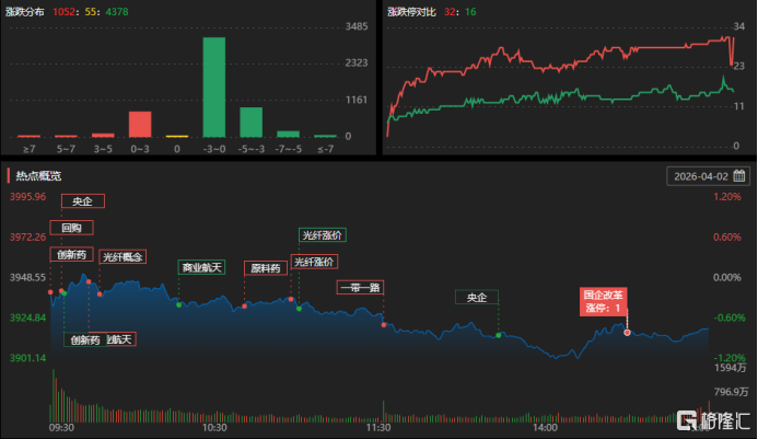 4月2日,A股三大指数集体下挫,全市场成交额1.86万亿元,较前一交易日缩量1670亿元。板块方面,油气、医药商业、猪肉概念等板块走强;贵金属、算力概念、影视院线等板块下挫。