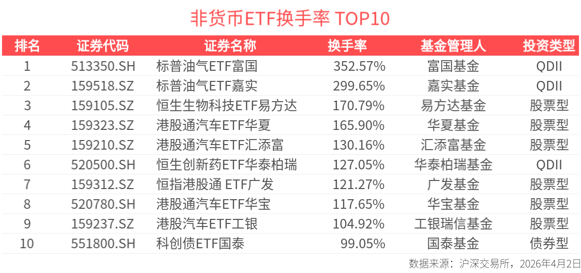 2026年4月2日,非货币类ETF合计成交5233.89亿元,其中有96只ETF成交额破10亿元。