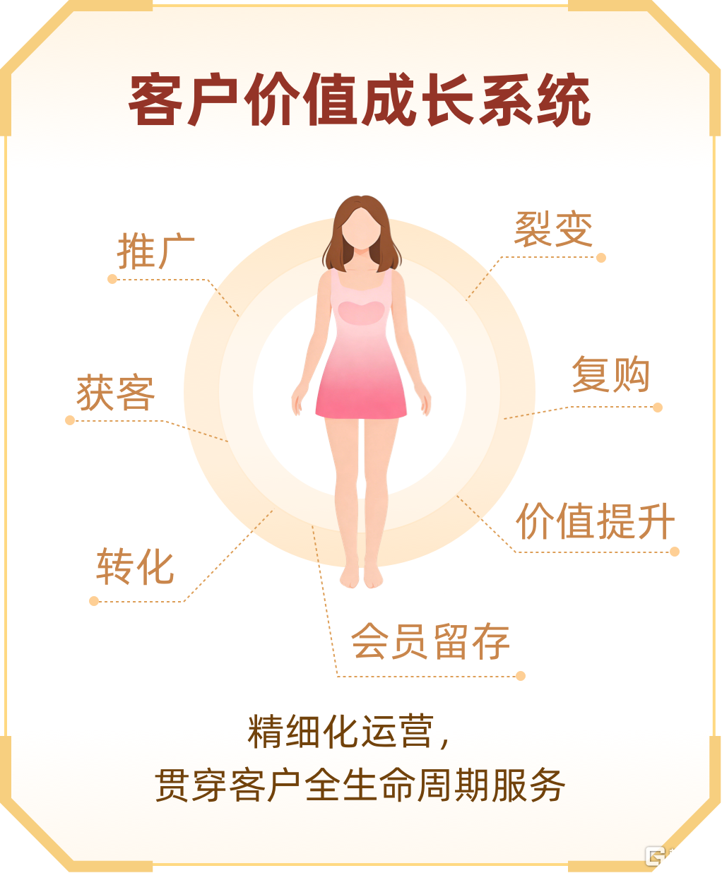 这套系统的精妙之处在于,它构建了覆盖推广、获客、转化、会员留存、价值提升、复购、裂变的全链路精细化运营闭环。
