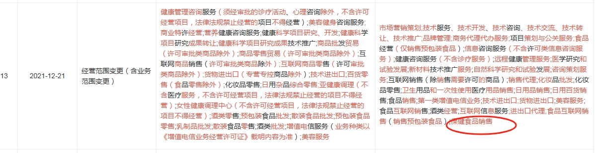 而广州雅拉源进军保健品领域至少4年多前已经开始布局谋划。2021年12月广州雅拉源的经营范围新增了保健食品销售。