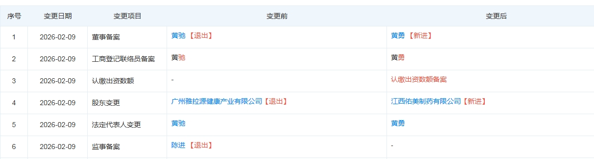 需要关注的是,黄驰还曾经实际控制广州天佑健康产业有限公司(以下简称广州天佑)。今年2月9日,黄驰控制的广州雅拉源将广州天佑的股权转让给了江西佑美制药有限公司(以下简称江西佑美制药),公司董事由黄驰变更为同为黄姓的黄伟。