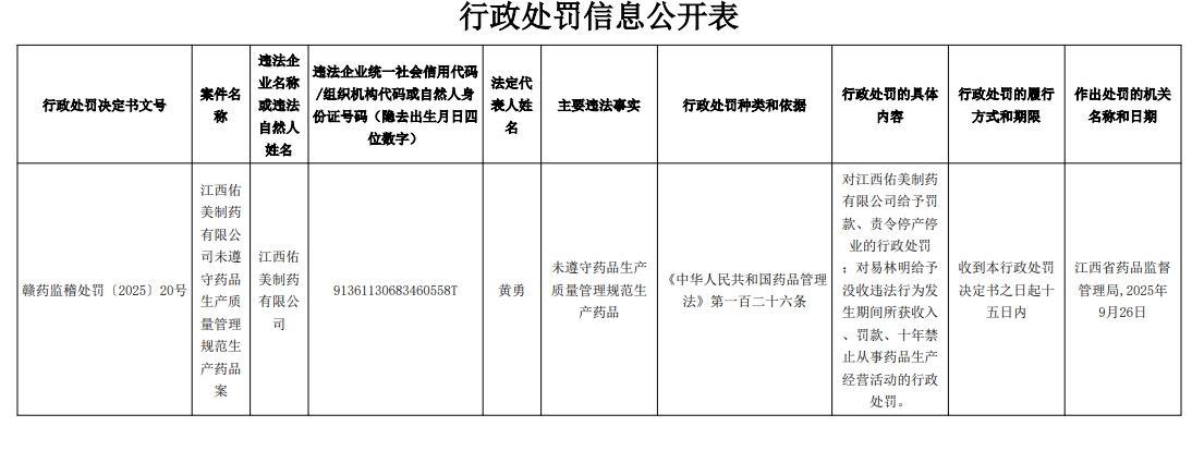 但随后不久,江西省药品监督管理局便向江西佑美药业开出罚单,行政处罚信息公开表显示,江西天佑药业未遵守药品生产质量管理规范生产药品,对其给予罚款、责令停产停业的行政处罚;对易林明给予没收违法行为发生期间所获收入、罚款、十年禁止从事药品生产经营活动的行政处罚。