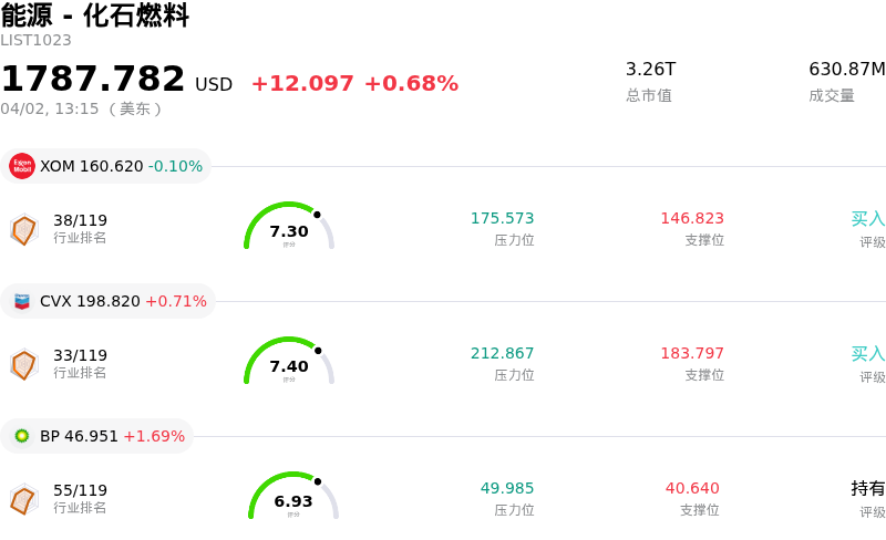Equinor ASA (EQNR) 盘中上涨3.12%, 所属行业能源 - 化石燃料上涨0.68% ,公司涨幅跑赢行业涨幅,行业成交额前三股票 埃克森美孚 (XOM) 下跌 0.10%;雪佛龙 (CVX) 上涨 0.71%;英国石油 (BP) 上涨 1.69%。