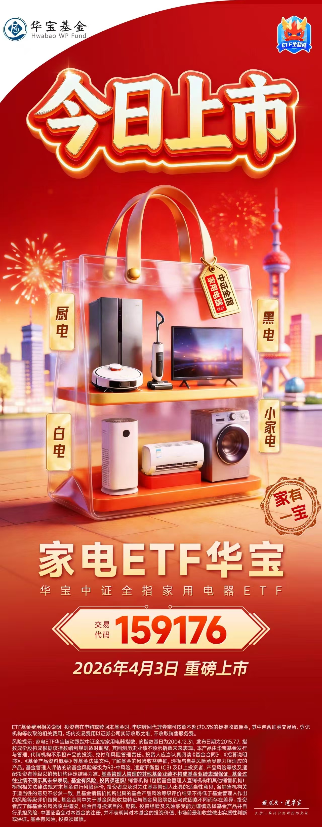 家电行业正迎来“政策 技术 出海”三重共振的黄金窗口期。今日(4月3日),家电ETF华宝(159176)正式在深圳证券交易所上市交易。