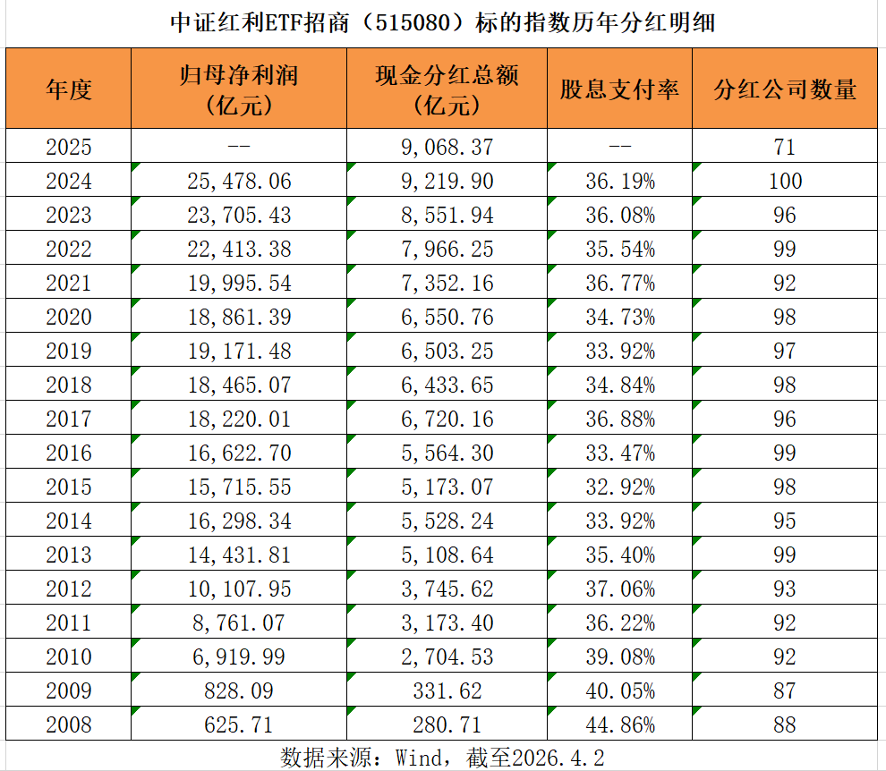 年报季进入密集披露期,中证红利指数成份股成分红主力军,目前已有71家成份股披露2025年分红方案,累计现金分红总额达9068亿元,其中16家公司分红超100亿元、14家超200亿。