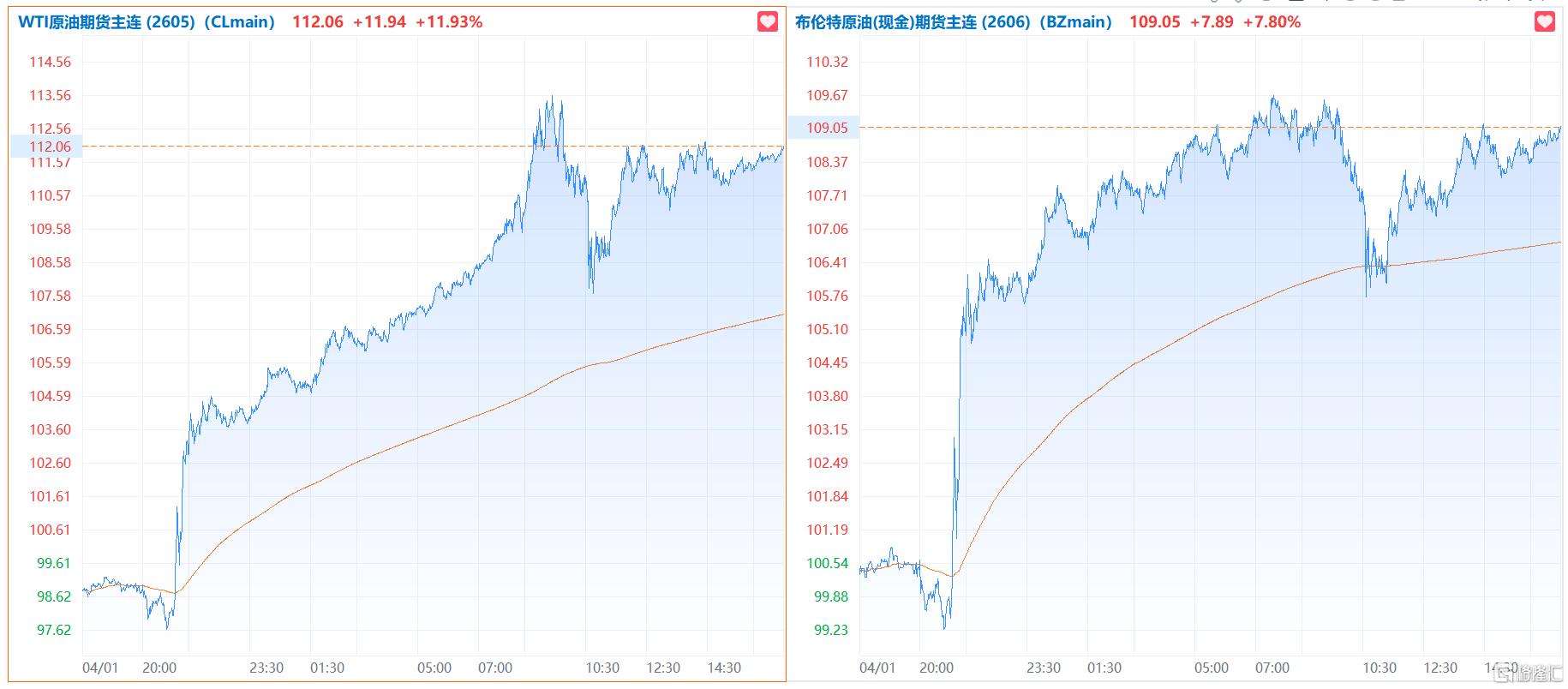 WTI原油期货狂飙近12%,布伦特原油期货大涨逾7%。